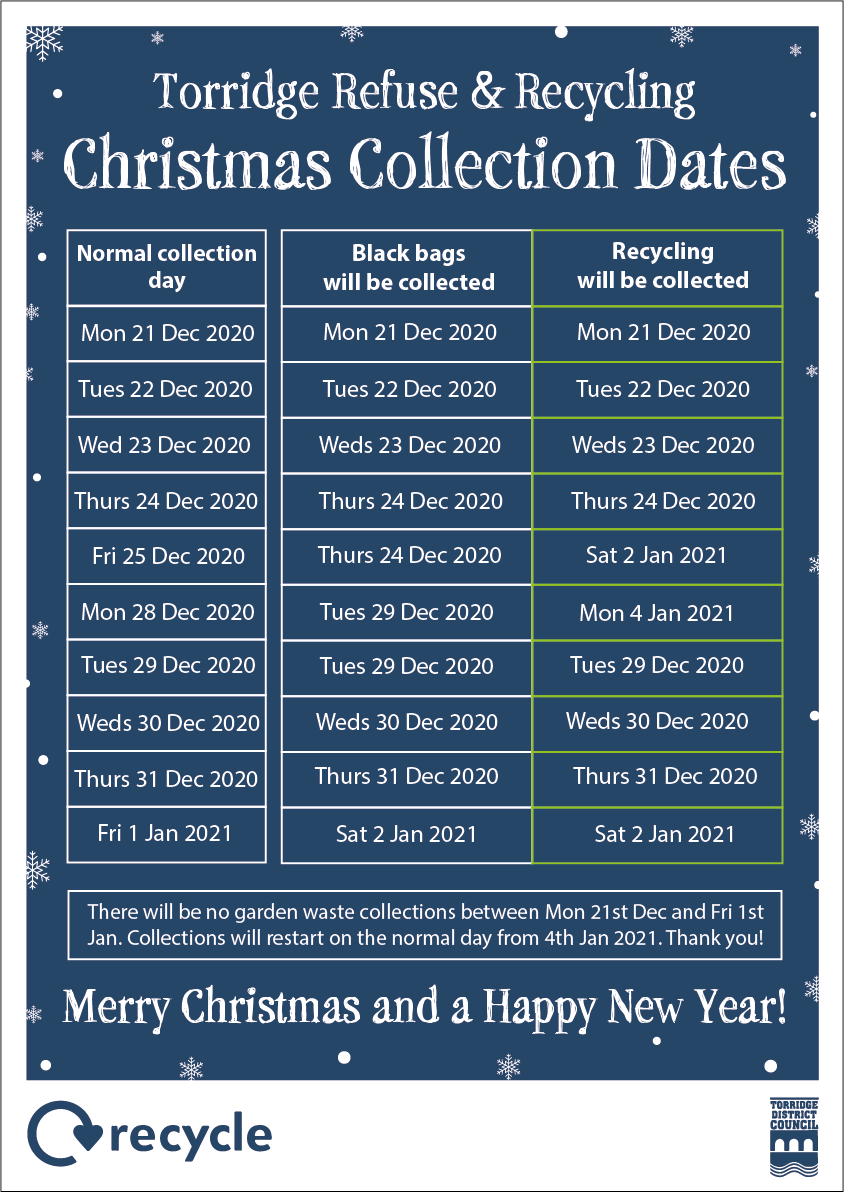To accommodate the extra work over this period there will be no Garden Waste (Green wheelie bin) collections between Monday 21st December and Friday 1st January. Collections will restart on the normal scheduled day from 4th January. Bulky item collections will also be suspended during this period.
